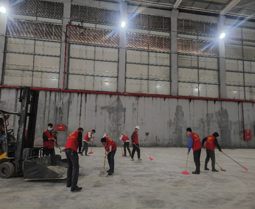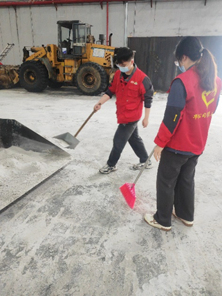 当天下午3时,志愿者们身着鲜艳醒目的红色志愿者服,准时在储运部原糖中转仓集合。在专业安全员细致入微地讲解作业规范,确保每一位参与者都明晰安全要点后,大家迅速有序地投入到热火朝天的工作当中。此次行动,志愿者们分工明确,协同高效,兵分三路齐头并进:第一组志愿者手持坚实的铁铲,目光坚定地聚焦在地面积垢之上,每一铲下去都带着十足的干劲,誓要将顽固污垢一扫而光;第二组则挥舞着扫把,所到之处,地面糖粉被清扫得干干净净,扫帚划过地面的沙沙声,仿佛是奏响的劳动乐章;第三组专注于分拣可回收物料,他们眼疾手快,不放过任何一个有价值的物品。活动现场,团员青年们个个奋勇争先,冲在劳动一线,展现出青春的蓬勃力量,女员工们同样巾帼不让须眉,纤细的双手在忙碌中充满力量。那些糖板结层,最厚之处超过 2 厘米,宛如坚硬的“铠甲”,但这难不倒团员青年们,他们两两一组,默契配合,汗水湿透了衣衫,他们却毫不在意,一铲一铲地敲松、清除,再稳稳当当地转运。经过1小时15分钟的艰苦奋战,成果斐然,累计清理面积高达 2040 平方米,回收可利用物料 200 千克,使原本的中转仓已然焕然一新,整洁有序。